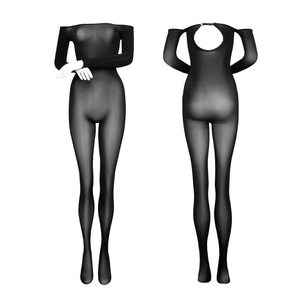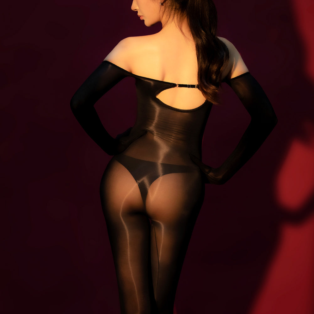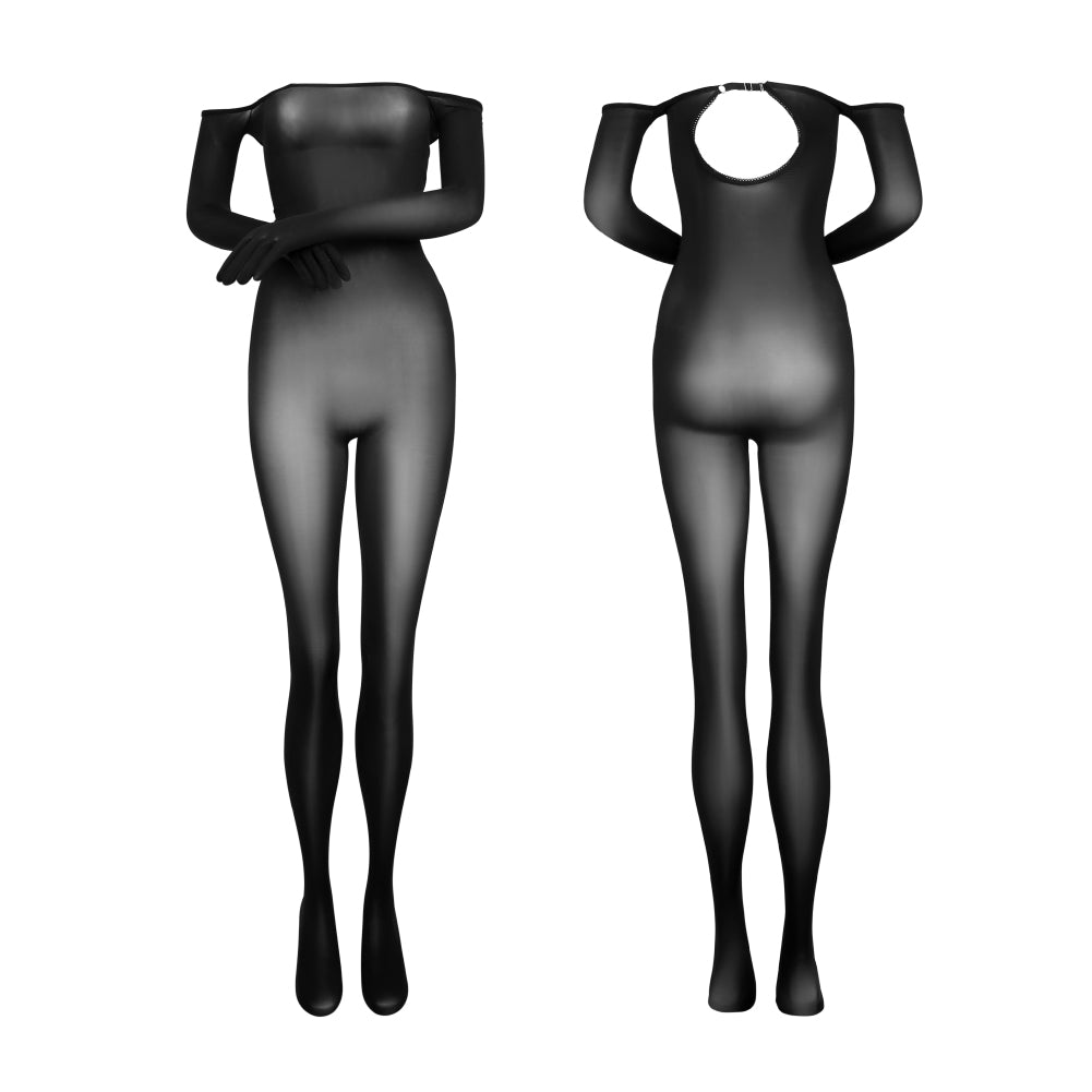 The Dimensiti bodysuit is a treat for the senses in so many ways. Visually, it is a masterpiece of seduction and artistry. The extraordinary elegance of the off-shoulder but long-sleeved look complements the perfect little rear cutout, and works very well with the full-body lingerie aesthetic. The fabric is so soft, shiny and slippery to the touch, magnificently thin, extremely stretchy and decidedly sheer. There is a gloved variant, as well as a crotchless variant to suit all tastes.