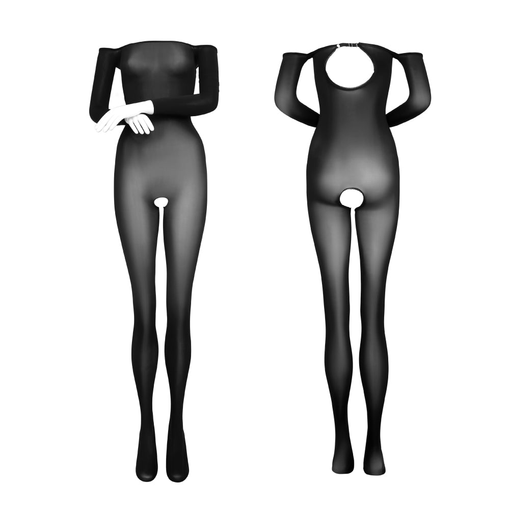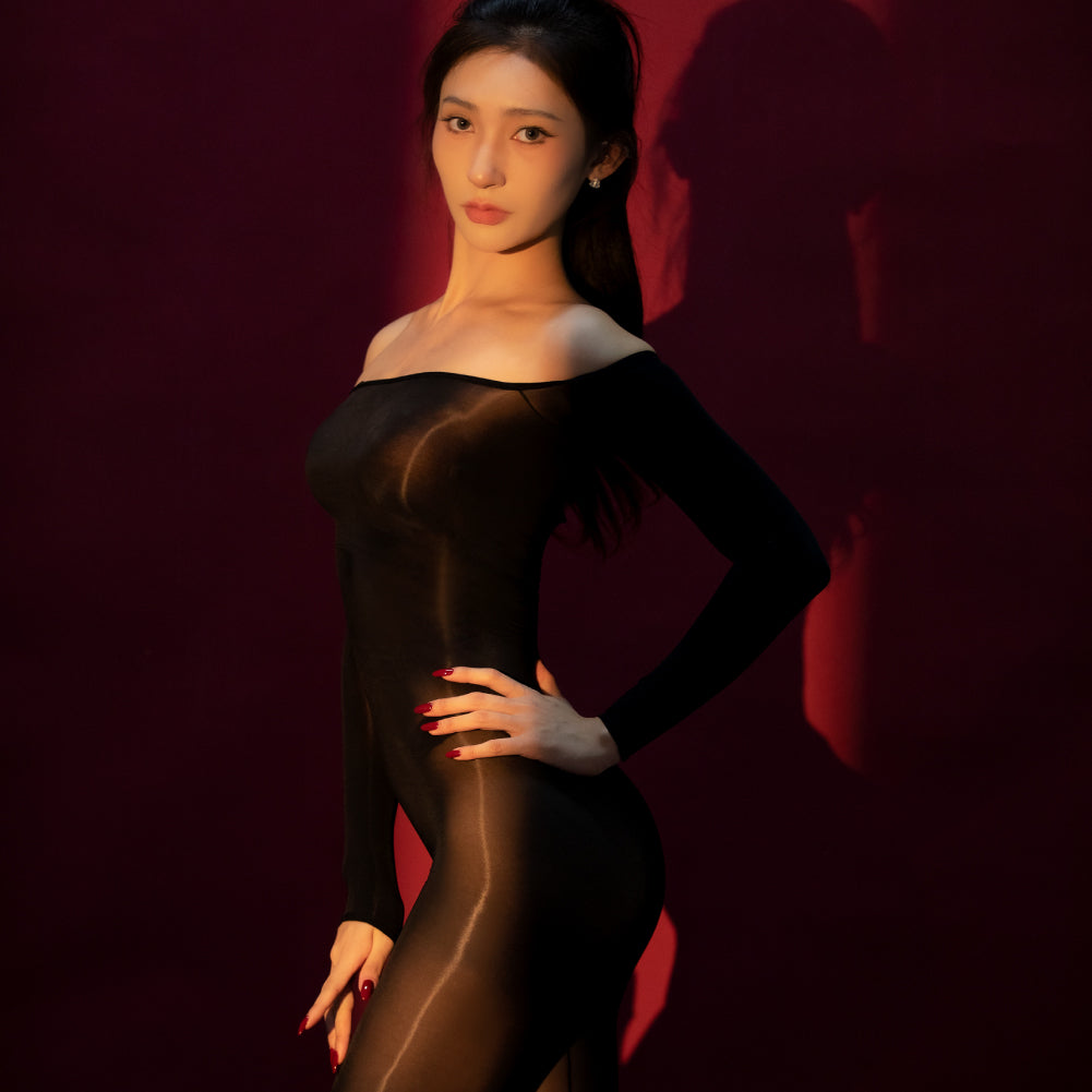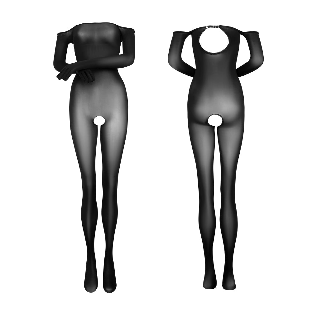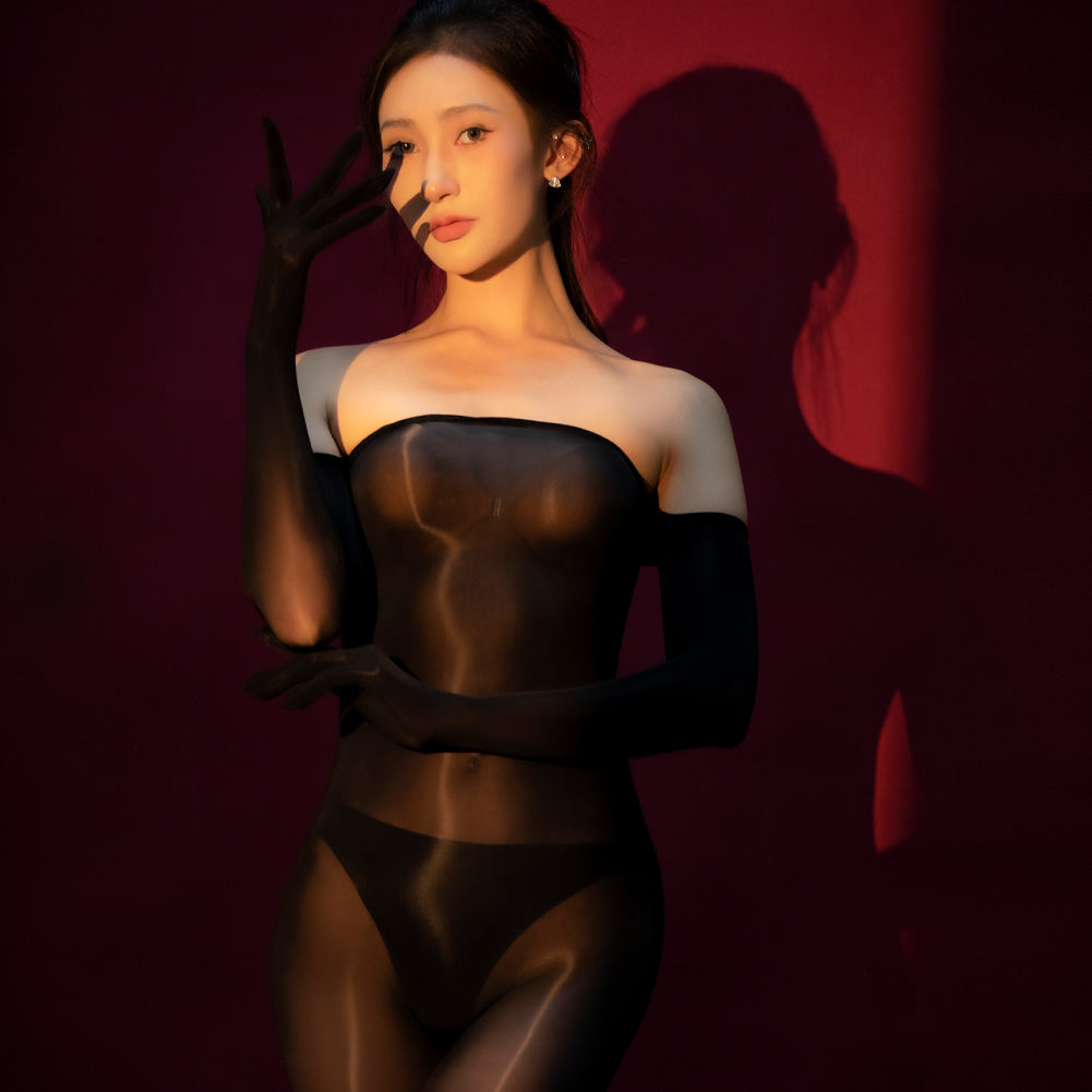 The Dimensiti bodysuit is a treat for the senses in so many ways. Visually, it is a masterpiece of seduction and artistry. The extraordinary elegance of the off-shoulder but long-sleeved look complements the perfect little rear cutout, and works very well with the full-body lingerie aesthetic. The fabric is so soft, shiny and slippery to the touch, magnificently thin, extremely stretchy and decidedly sheer. There is a gloved variant, as well as a crotchless variant to suit all tastes.