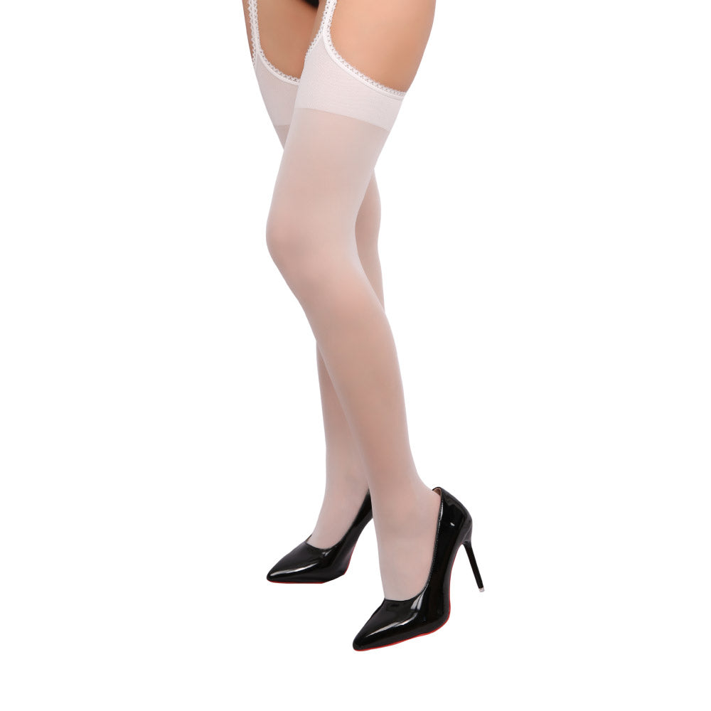 The Evocati Stockings are crafted from an exquisitely soft, sheer fabric that caresses the legs with a deluxe matte veneer. Their seamless design ensures a flawless, uninterrupted look from toe to thigh, where they meet a bold, intricate lace band that serves as both a sensual highlight and the perfect anchor for a garter belt.