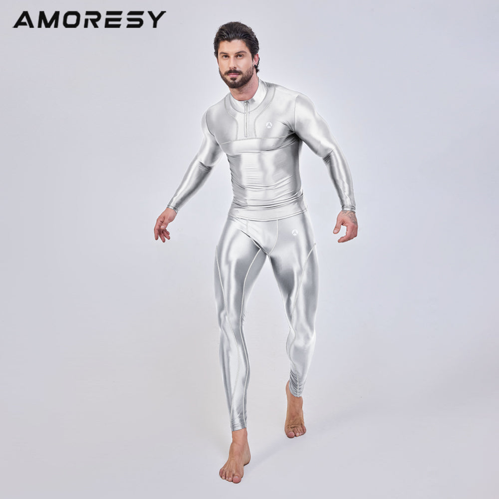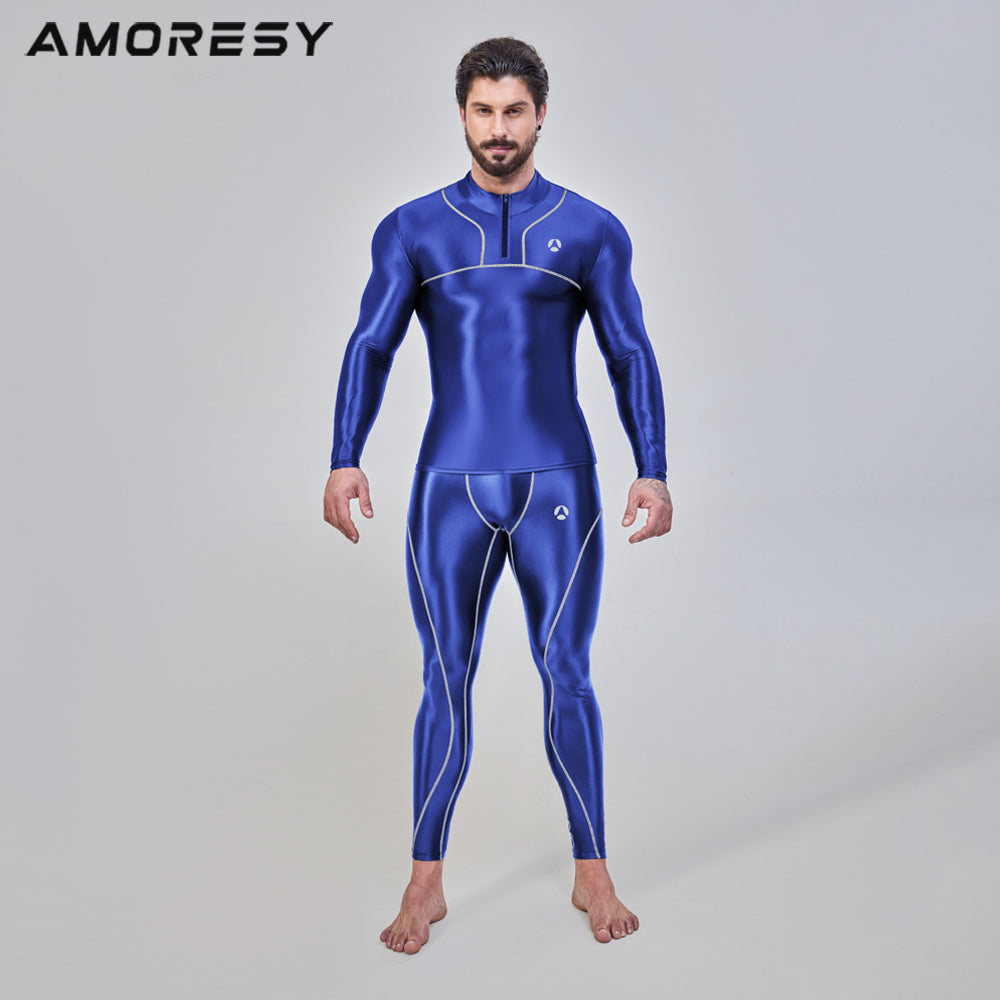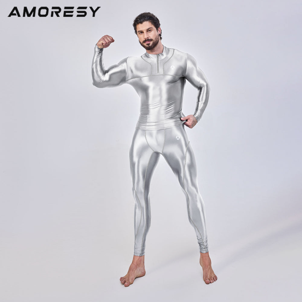 The Jupiter matching top and leggings set creates a powerful look. The fabric is our sensational Sliktex Classic spandex which is ultra-stretchy, super-shiny and very supportive. It is designed to embrace your body's natural form, creating a silky smooth second skin. The top has a small neck zip for ease of entry, and the leggings have an elasticated waistband. The interesting seamlines add to the sporty feel, and the funky little AMORESY logo shows people that you know how to buy high-end spandex!