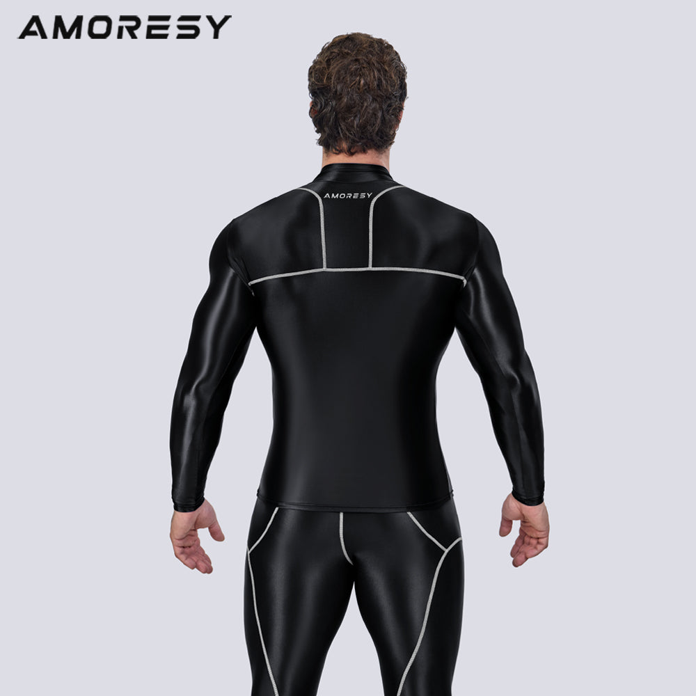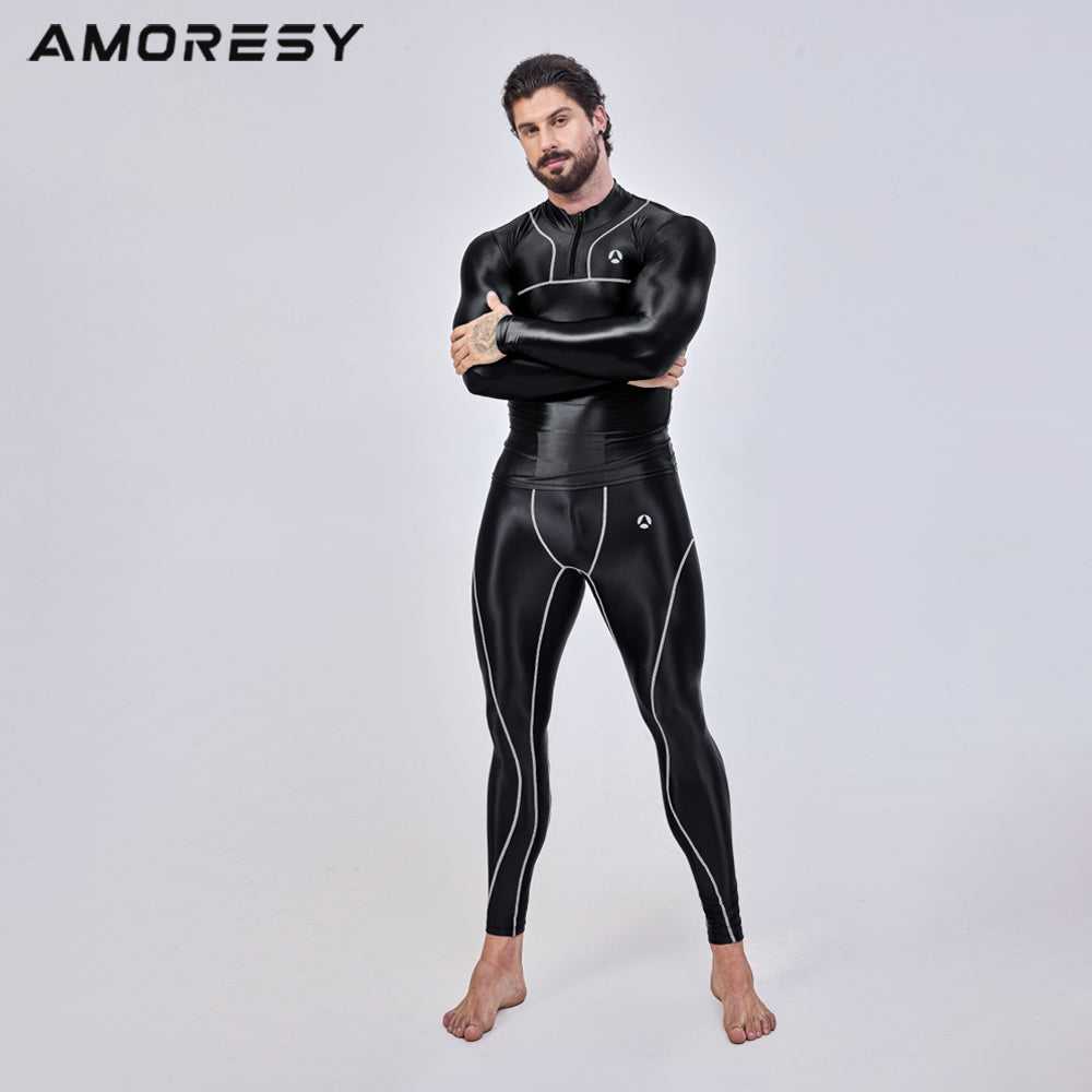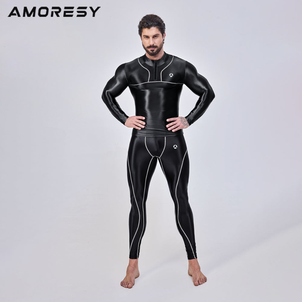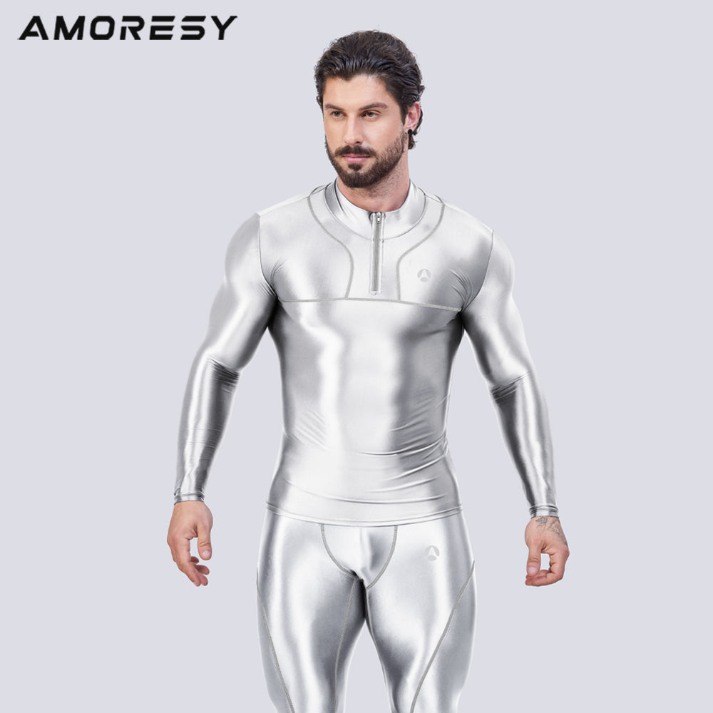 The Jupiter matching top and leggings set creates a powerful look. The fabric is our sensational Sliktex Classic spandex which is ultra-stretchy, super-shiny and very supportive. It is designed to embrace your body's natural form, creating a silky smooth second skin. The top has a small neck zip for ease of entry, and the leggings have an elasticated waistband. The interesting seamlines add to the sporty feel, and the funky little AMORESY logo shows people that you know how to buy high-end spandex!