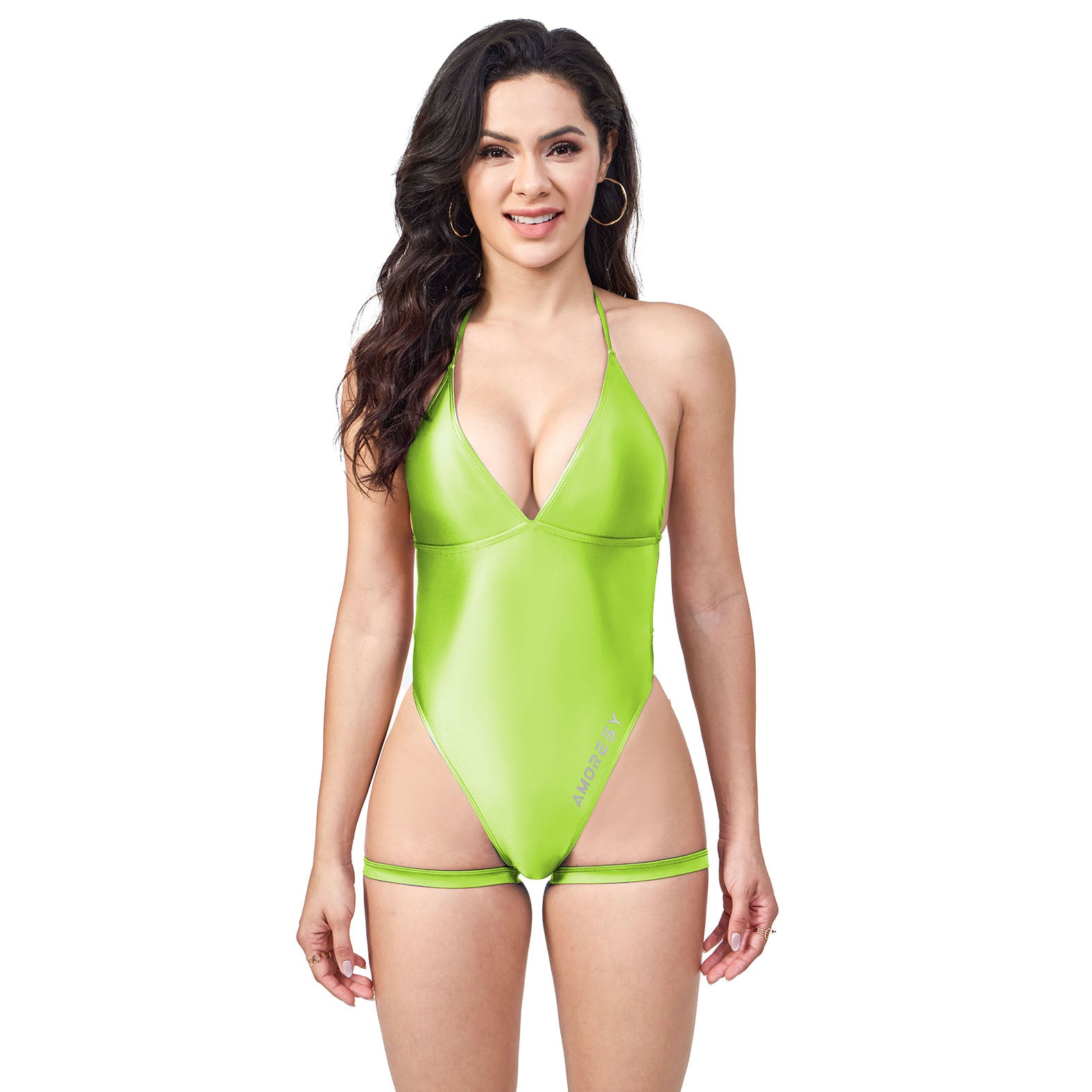 The Nyra swimsuit is simply dripping with drama. The beautiful plunging neckline creates a magnificent cleavage moment, the daring thong cut leaves little to the imagination, and the whimsical leg straps add a unique style element. The contrast between front and back is also powerful, from a seemingly full swimsuit at the front, to completely backless at the rear.