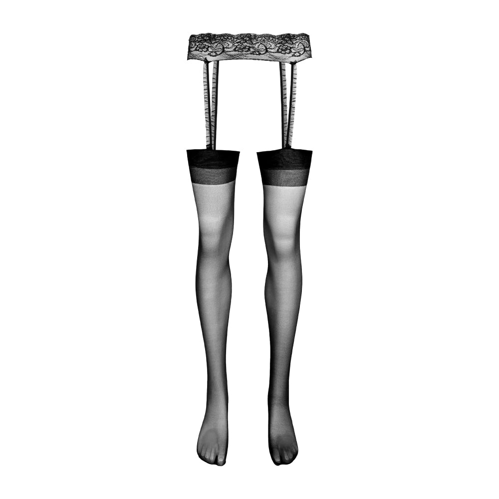 Yes, a luxurious high-end stockings and garter belt set for men! Made from extra-thin fabric, the Tenaciti stockings are extremely sheer, coating the legs in a deliciously soft coating. They are connected to the ornate lace garter belt by delicate little straps, creating a very seductive appearance.
